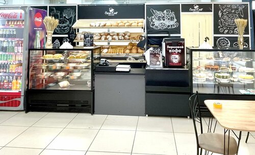 Свежая выпечка хлеба, пиццы, бургеров и хот-догов. Десерты, торты. Кофе с собой.